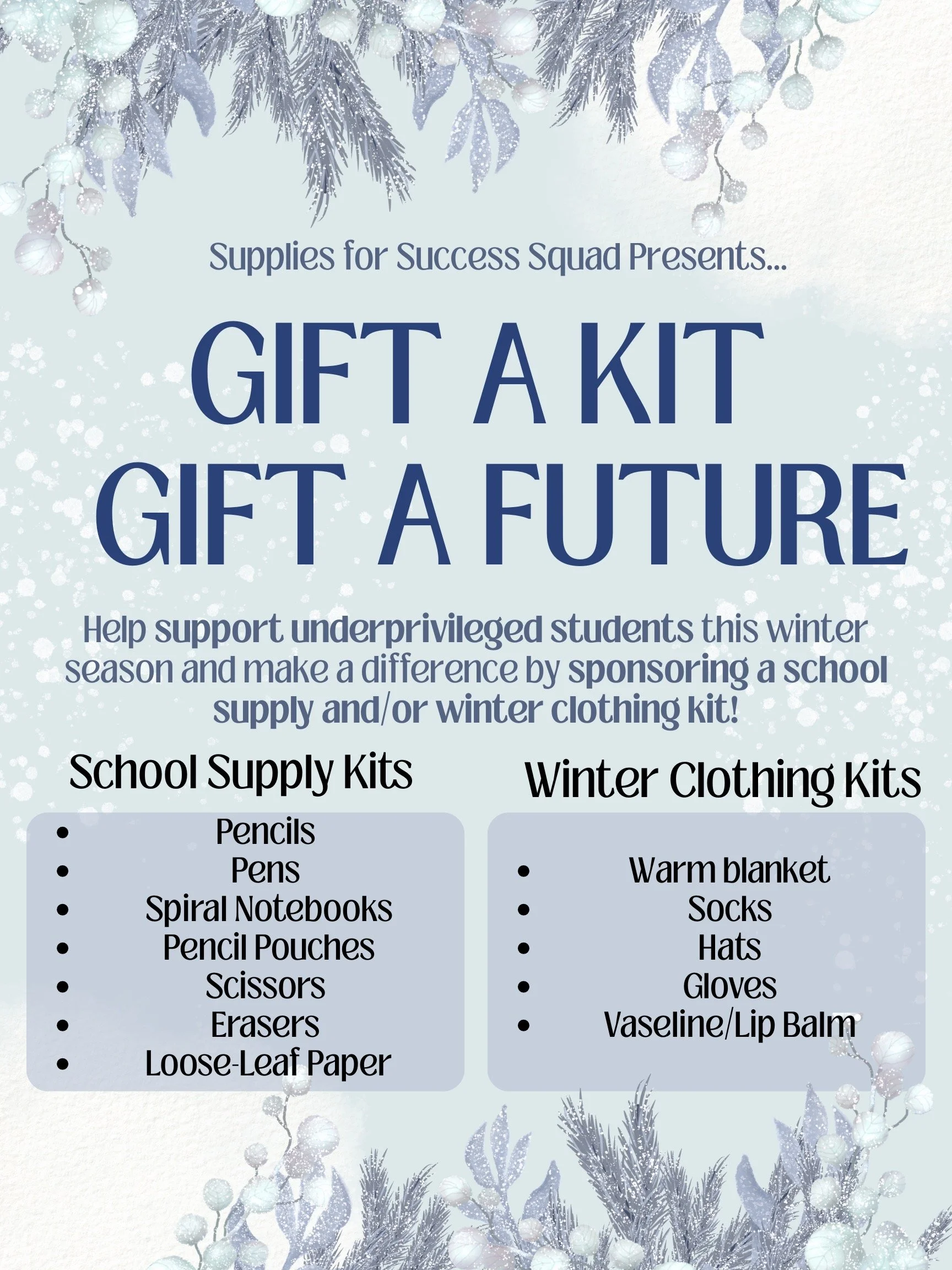 Supplies for Success Squad’s Winter Fundraiser focuses on supporting underprivileged students by providing essential School Supply Kits and Winter Clothing Kits to students in need. With just $10, donors can sponsor a Winter Clothing Kit to help keep a child warm, or with $12, help provide a School Supply Kit that allows a student to feel confident and prepared in the classroom. Every donation goes directly toward setting up students for success and ensuring they stay warm, prepared, and supported this winter season.